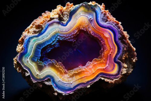 Abstract Cross-Section of Agate: A Colorful Geode Specimen, Embodying the Richness of Nature's Hidden Gems, Unveiling a Mesmerizing Crystalline Structure on a Polished Chalcedony Surface