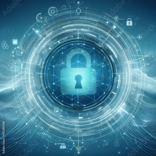 Abstract cyber security concept with a padlock icon, network data and dynamic lines on a light blue background