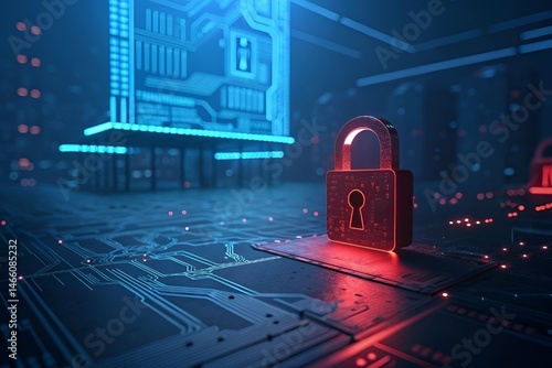 Abstract Cybersecurity Lock in Blue and Red Digital Landscape