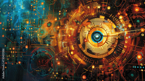 Abstract cyberspace background, data pattern in dark digital space, cyber information in blue orange light. Concept of technology, secure tech, network, art