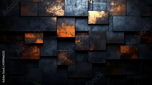 Abstract dark background of textured, metallic squares in shades of black, copper, and bronze. Ideal for industrial, grunge, or modern design projects.
