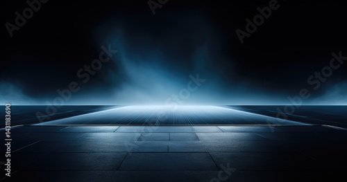 Abstract dark background with glowing blue light, smoke and reflection on the asphalt floor. Dark scene for product display presentation design vector illustration