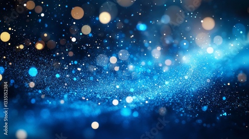 Abstract dark blue gradient with shimmering glitter particles and blurred bokeh lights