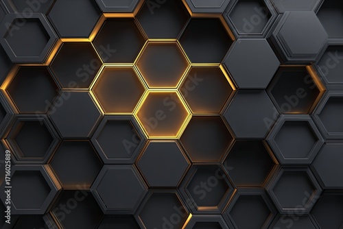 Abstract dark grey hexagonal pattern with glowing gold inner edges on some hexagons creating a three-dimensional effect