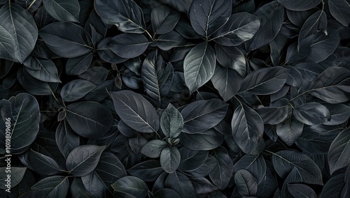 Abstract dark grey leaves texture background, black leaves pattern wallpaper for nature concept. Top view of green foliage leaves on forest floor.