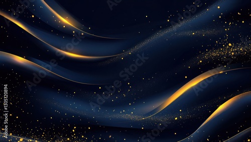 Abstract dark navy blue background with golden flowing lines and shimmering particles.