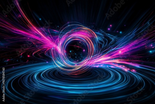 Abstract depiction of atomic structures with vibrant electron trails in a mesmerizing cosmic setting, showcasing dynamic colors and fluid motion