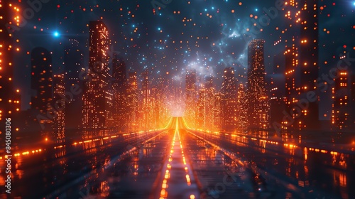 Abstract depiction of global data transfer in a futuristic metropolis at night, characterized by extremely high speeds and super-fast broadband, rendered through generative AI.