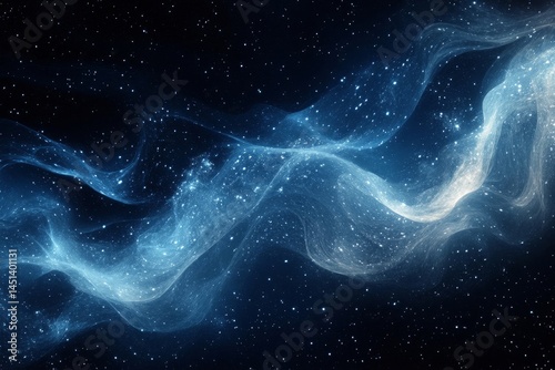 abstract depiction of swirling snowflakes in silver and blue gradients scattered on a dark navy background, Generative AI