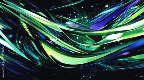 Abstract design featuring flowing shapes and vibrant colors on a dark background.