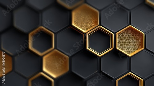 Abstract design featuring hexagonal patterns in black and gold, creating a modern aesthetic