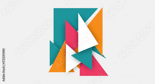 Abstract design featuring overlapping triangles in teal orange pink and white on a gray background