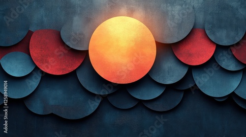 Abstract Design with Sun and Layered Circular Shapes in Blue Red