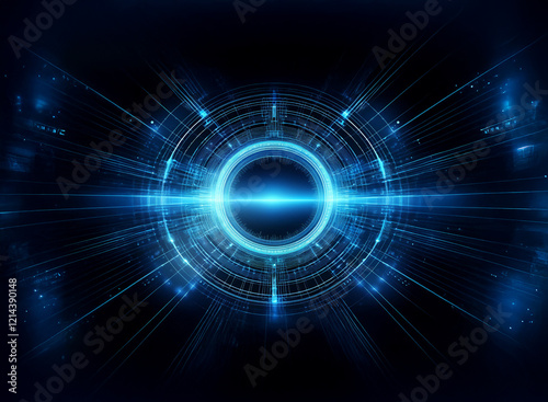 Abstract digital art depicting a glowing blue circular interface with radiating light streaks against a dark background. The image evokes themes of technology, energy, and futuristic design.