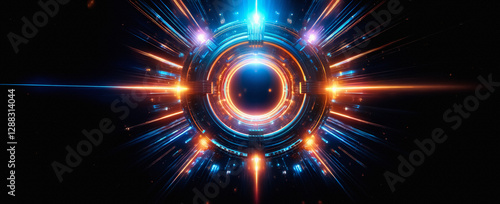 Abstract digital art featuring a vibrant circular design with radiating blue and orange light beams against a dark background, creating a dynamic and futuristic effect.