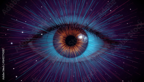 Abstract digital art of a human eye with radiating light beams and cosmic elements.
