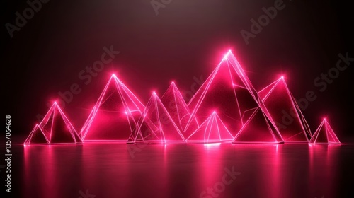 Abstract digital art of pink glowing pyramids reflecting on a dark surface. The pyramids are composed of sparkling particles and emit a bright light.