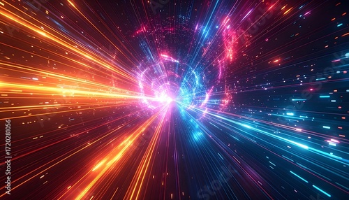 Abstract digital art piece featuring vibrant light rays exploding from a central point, creating a dynamic, colorful vortex against a dark background