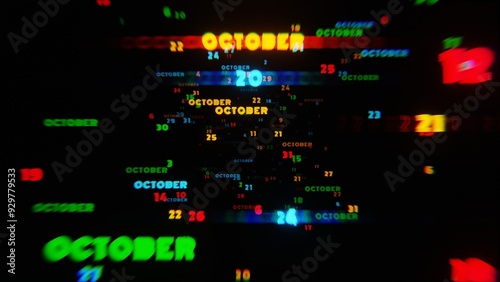 Abstract digital art with glowing text representing the month of October in striking neon colors on a dark background