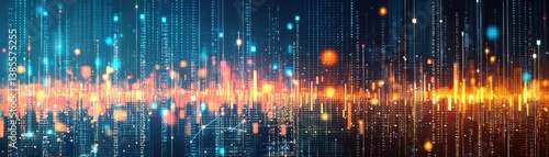 Abstract digital artwork depicting vibrant light beams and data streams representing technology and innovation in a futuristic landscape