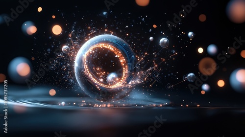 Abstract digital artwork featuring a luminous spherical shape with glowing particles and vibrant lights, creating a sense of motion and depth in a futuristic environment
