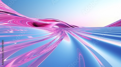 Abstract digital artwork featuring flowing pink and blue shapes, resembling liquid or glossy reflections, set against a gradient sky