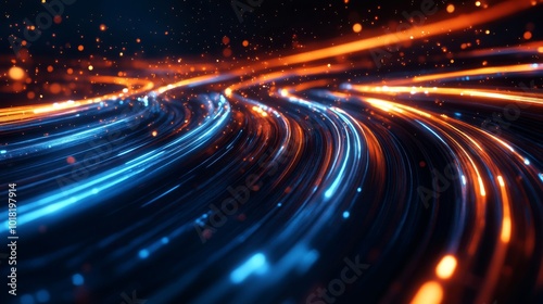 Abstract digital artwork of swirling blue and orange light trails on a black background