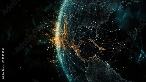 Abstract digital background featuring a glowing Earth with interconnected nodes, representing the internet, blockchain technology, and global data exchange, high-tech business and communication theme.