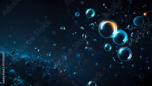 Abstract digital background featuring clusters of bubbles in different sizes, suspended in a dark blue cosmic void