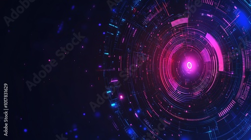 Abstract digital background with a glowing red circle in the center and a blue and pink light trail on a dark background.