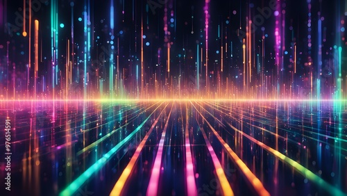 Abstract digital background with colorful lines and glowing particles.