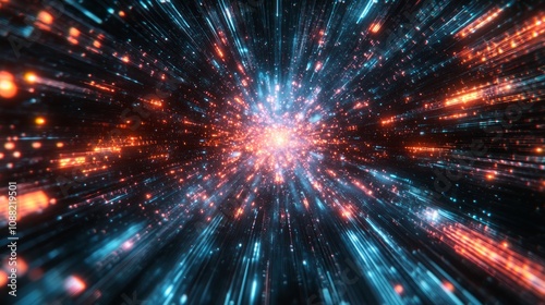 Abstract digital background with glowing blue and orange light streaks emanating from the center on a black background.