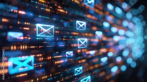 Abstract Digital Background with Glowing Blue Mail Icons and Orange Lines