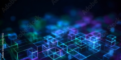 Abstract digital background with glowing holographic cubes and lines in blue, green, and purple colors on a dark black background.