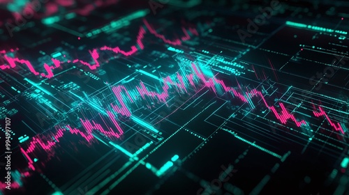 Abstract digital background with vibrant pink and teal financial graphs and data flow, illustrating market trends and analysis.