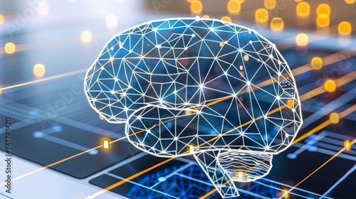 Abstract digital brain with geometric patterns and glowing nodes, representing AI, neural networks, and advanced technology. Ideal for illustrating concepts in innovation and machine learning