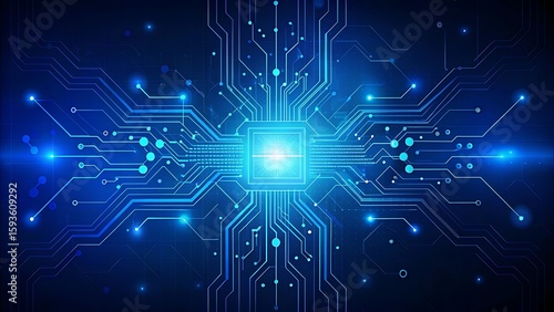 Abstract digital circuit board on technology blue background. Circuit connected lines and dots on abstract motherboard. Navy gradient tech bg. AI innovation concept. Futuristic illustration.