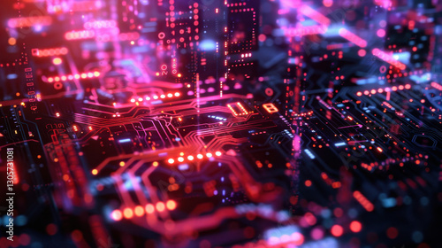 Abstract digital circuit board with glowing lights in red and blue hues, showcasing technology and innovation. vibrant colors create futuristic atmosphere