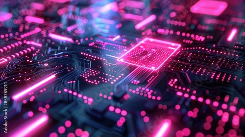 Abstract digital circuit board with glowing neon lights. Perfect for technology, innovation, and future themes.