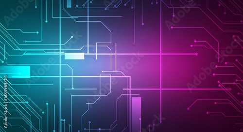 Abstract digital circuit board with glowing neon lines in blue and purple hues