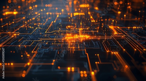 Abstract Digital Circuitry: Glowing Orange Pathways of Data