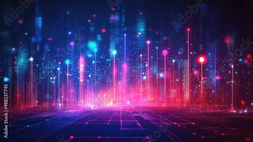 Abstract digital city with neon lights. Perfect for technology, innovation, and futuristic concepts.