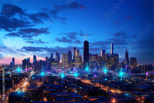 Abstract Digital Cityscape with Glowing Dots and Lines Forming Futuristic Urban Landscape