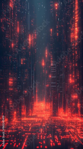 Abstract Digital Cityscape with Red Lights and Glowing Lines