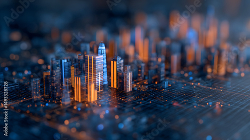 Abstract digital cityscape with skyscraper-like structures in blue and orange hues on a grid background, concept of data analysis. Generative AI 12665042 4