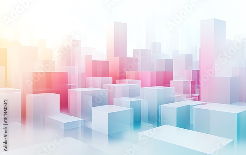 Abstract digital cityscape with soft pastel geometric buildings, white background, 3D rendering showcasing technology and modern urbanization