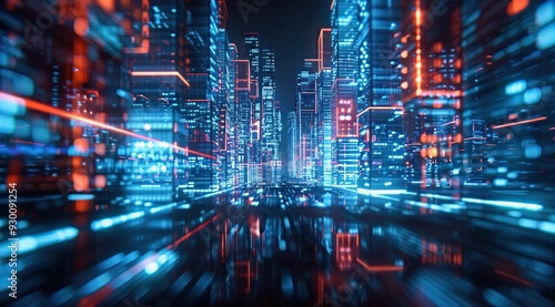 Abstract digital cityscape with vibrant neon lights, representing futuristic urban environments and digital technology
