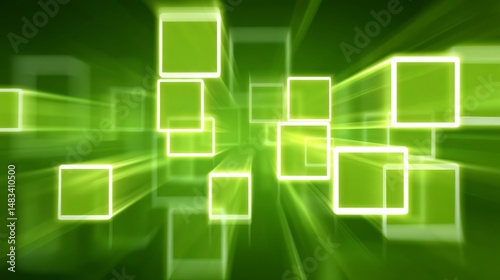 Abstract Digital Composition of Glowing Green Squares with Dynamic Light Effects
