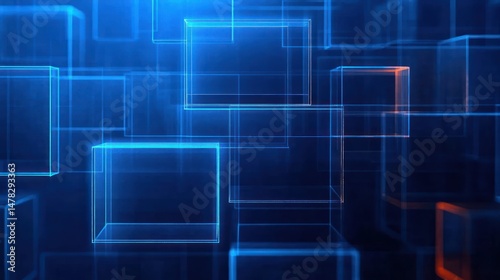 Abstract digital composition of glowing transparent cubes floating in a dark blue space with hints of orange highlights creating a futuristic and technological feel