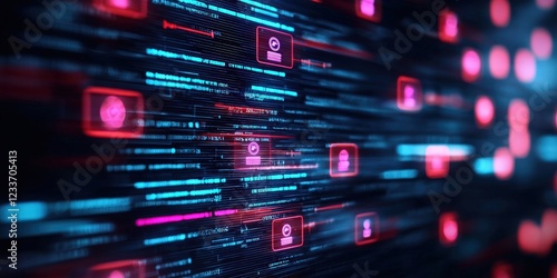 Abstract Digital Data Network Flow With Colorful Icons and Lines on a Computer Screen